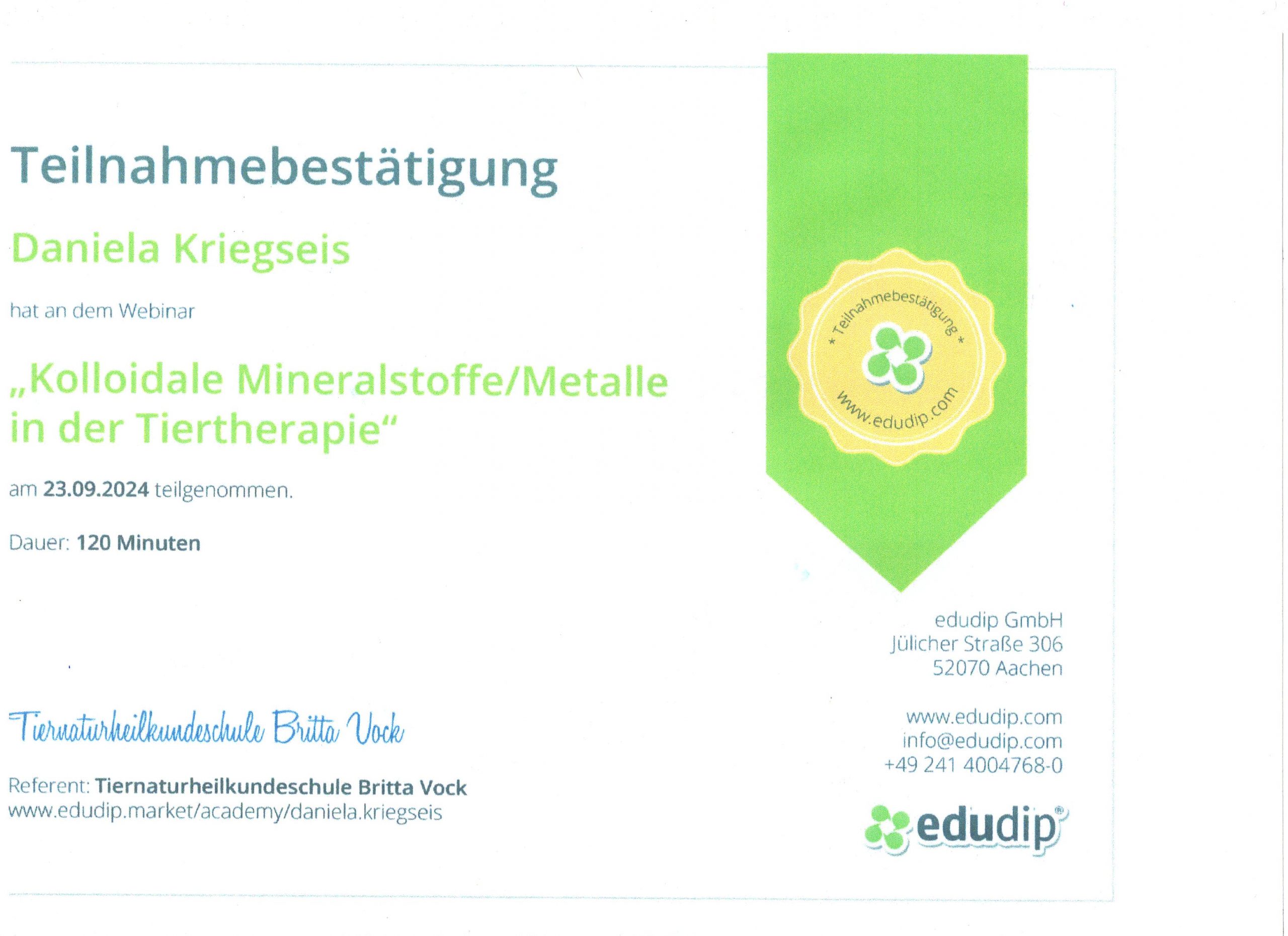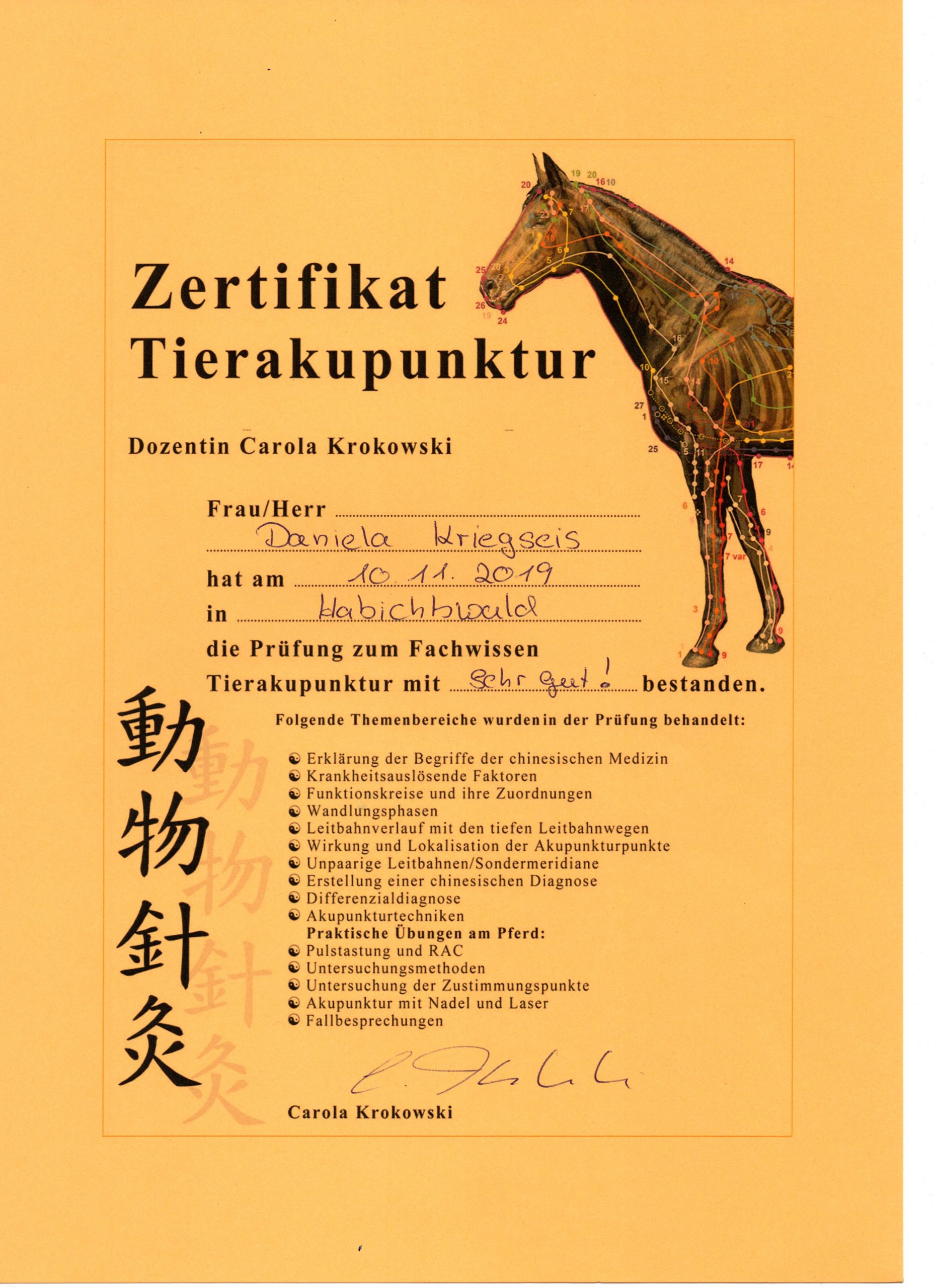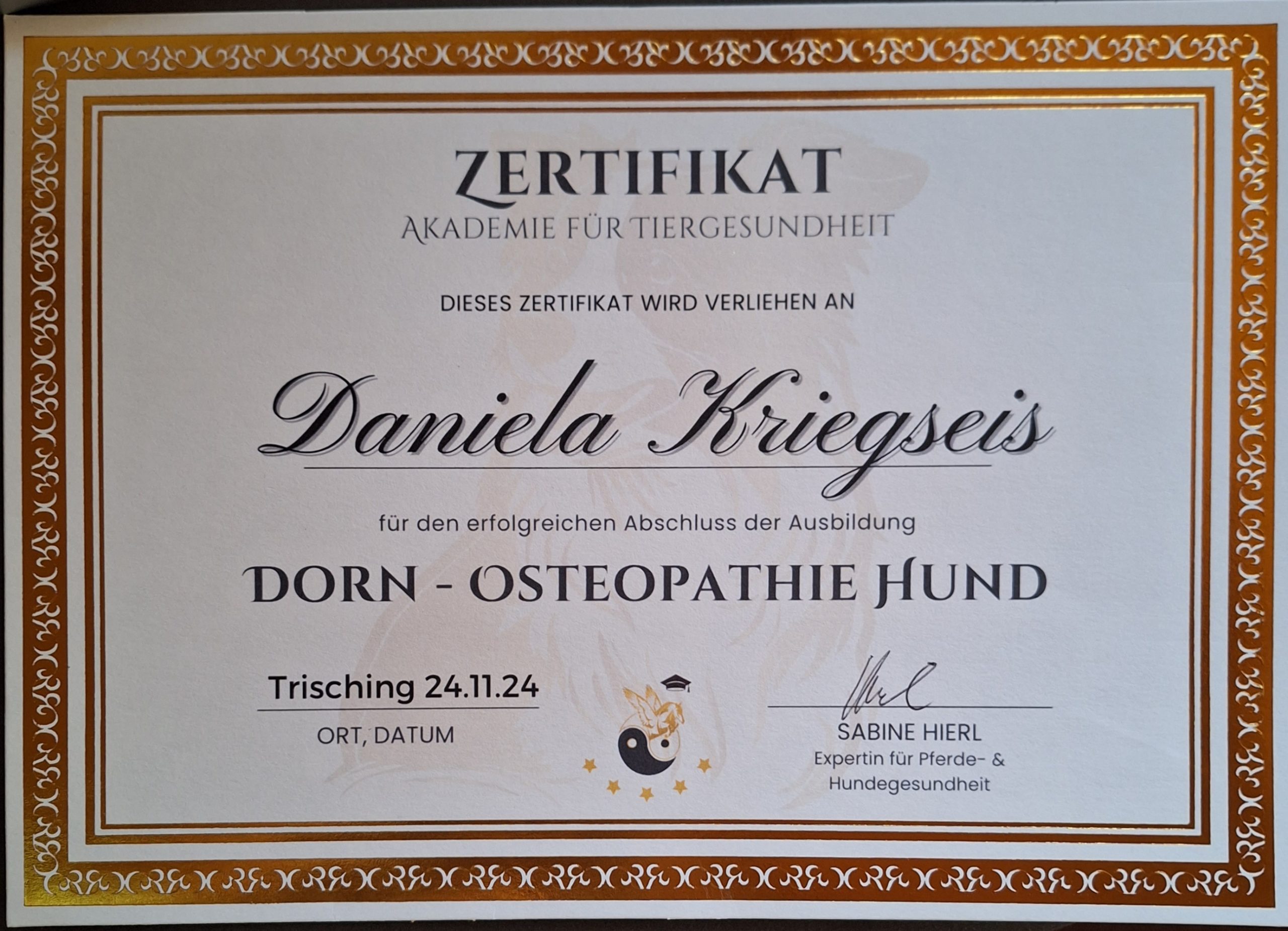 Nachdem ich zahlreiche Bücher zur Tierakupressur studiert hatte, wurde mein Wunsch, mehr über Tierakupunktur zu erfahren, immer größer. So entschloss ich mich 2019, eine Ausbildung zur Tierakupunkteurin bei Carola Krokowski zu absolvieren. Diese Entscheidung öffnete mir die Tür zu noch tieferem Wissen und einer noch breiteren Methodenkombination in der Naturheilkunde.